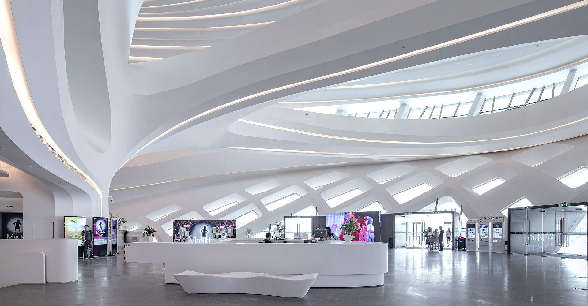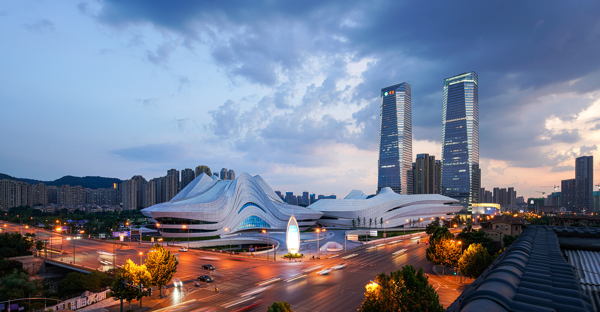 本项目三个建筑造型缘起于“梅花”,每个单体由“梅花”的花瓣衍生而来。大剧场为四片花瓣,艺术馆为三片花瓣,小剧场为一片花瓣,高高低低地散落在梅溪湖畔。三个抽象的造型均为行云流水般的流线型设计,主体均为(钢)框架-钢筋混凝土剪力墙结构体系,屋盖均为单层钢网格结构体系。
