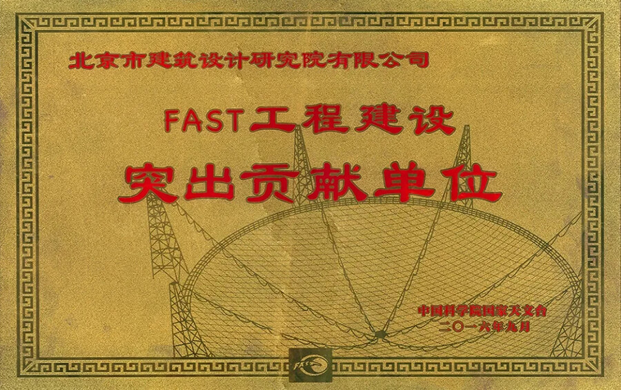 大跨度复杂建筑结构设计和研究是北京建院的传统优势领域之一。2011年,北京建院开始参与FAST主动反射面主体支承结构的咨询、设计工作,朱忠义作为设计团队负责人,在设计过程中攻坚克难,创新多项设计方法,取得的成果居于国际领先水平,为FAST建设做出了突出贡献。朱忠义本人更是被评为“FAST工程建设突出贡献个人”,同时为公司赢得“FAST工程建设突出贡献单位”和“贵州省五一劳动奖状”等荣誉称号。