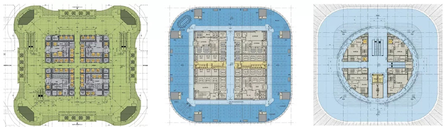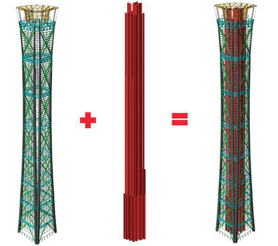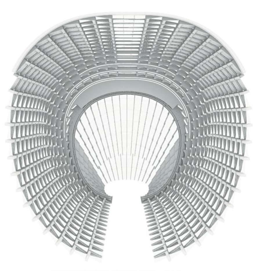 为降低结构重心,建筑顶部30米造型巨构外筒提前结束,由内筒逐渐出挑支撑顶部空间造型,建筑外幕墙上只有幕墙的二次结构,大大提升建筑顶部的观光条件。