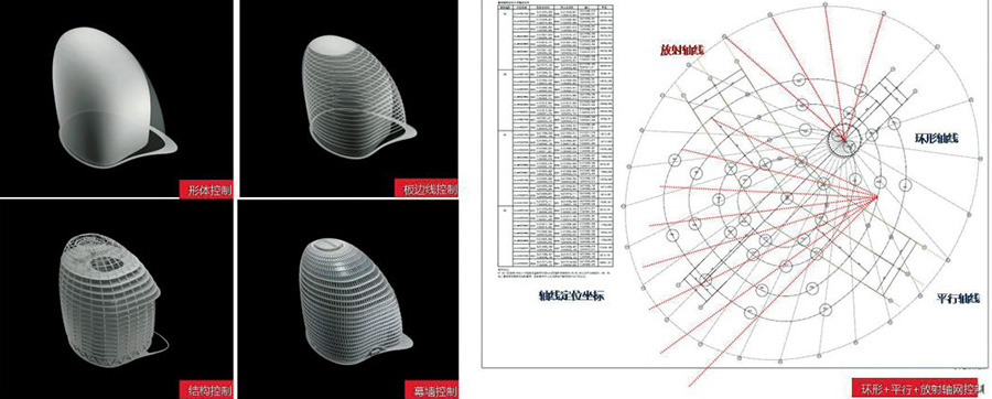 复杂建筑的关键在于三维几何控制,通过逻辑清晰可描述的体系来进行定义形体、板边线、结构柱轴线、幕墙基础定位线等。本项目利用放射轴面和弧形平行轴面的组合轴网进行整体控制,前者控制幕墙及外围幕墙柱的形式一致,后者控制核心筒及功能平面,两者相对独立又相互关联,所有几何元素都在轴网和控制体的基础上通过计算得到。