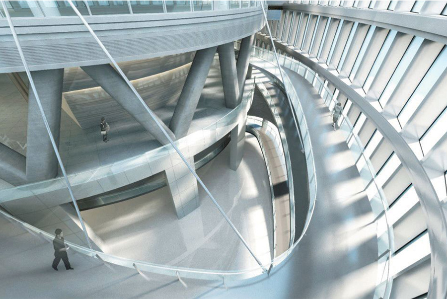 蛇形坡道从B1 环绕到二层,巧妙地与边庭空间融合。通过蛇形坡道可以在建筑东南角12 层通高边庭内漫游,感受独特的公共空间。