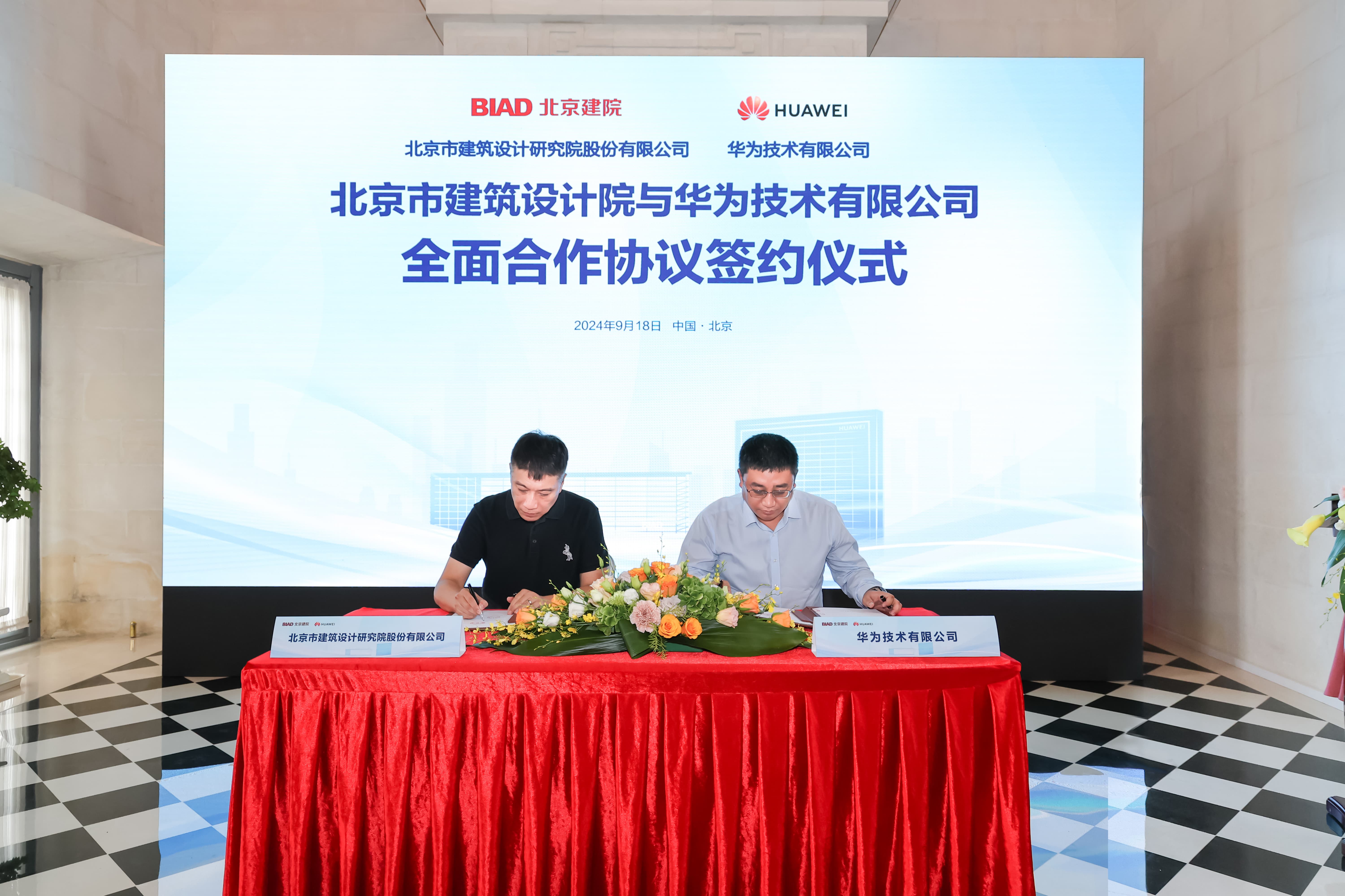 北京建院数字科技研究院院长林卫、华为北京政企商业销售部部长公磊分别代表双方签署全面合作协议。