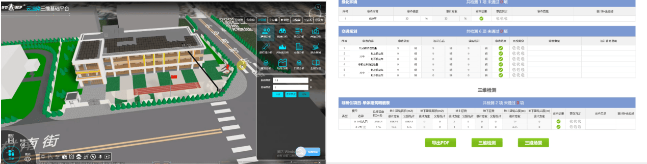 北京建院研发的北京市二三维一体化BIM审查系统,服务于北京市工程建设项目全程网办电子报建。项目建设单位在进行项目申报时,委托设计单位协同完成申报材料准备。设计单位在规自委网站下载报建工具插件,对已经设计完成的图纸进行数据整理,并进行规划指标自检,自检合格后生成电子报审的标准数据BDB格式文件。建设单位在北京市工程建设项目审批管理系统完成申报后,进入网上办件流转环节,业务人员在项目审批办事服务平台中使用二三维一体化BIM审查系统在线进行审查。审查过程中,在原有的办件审查过程中,增加了二维三维联动精细化审查环节,例如建筑面积等重要规划指标全部可以实质性智能审查。北京市二三维一体化BIM审查系统除了主要审查项目规划指标外,同时对于项目的周边也可进行智能审查。